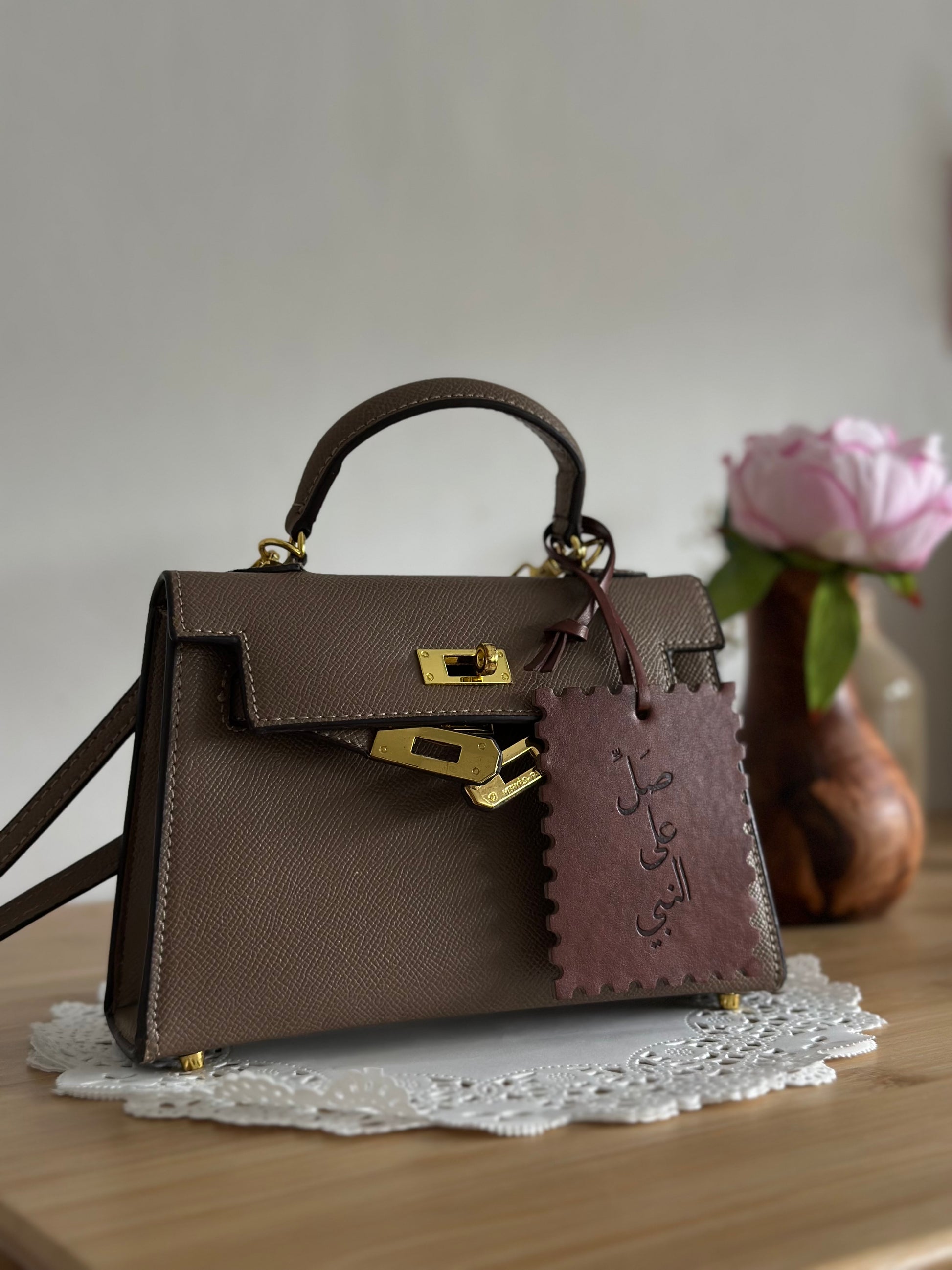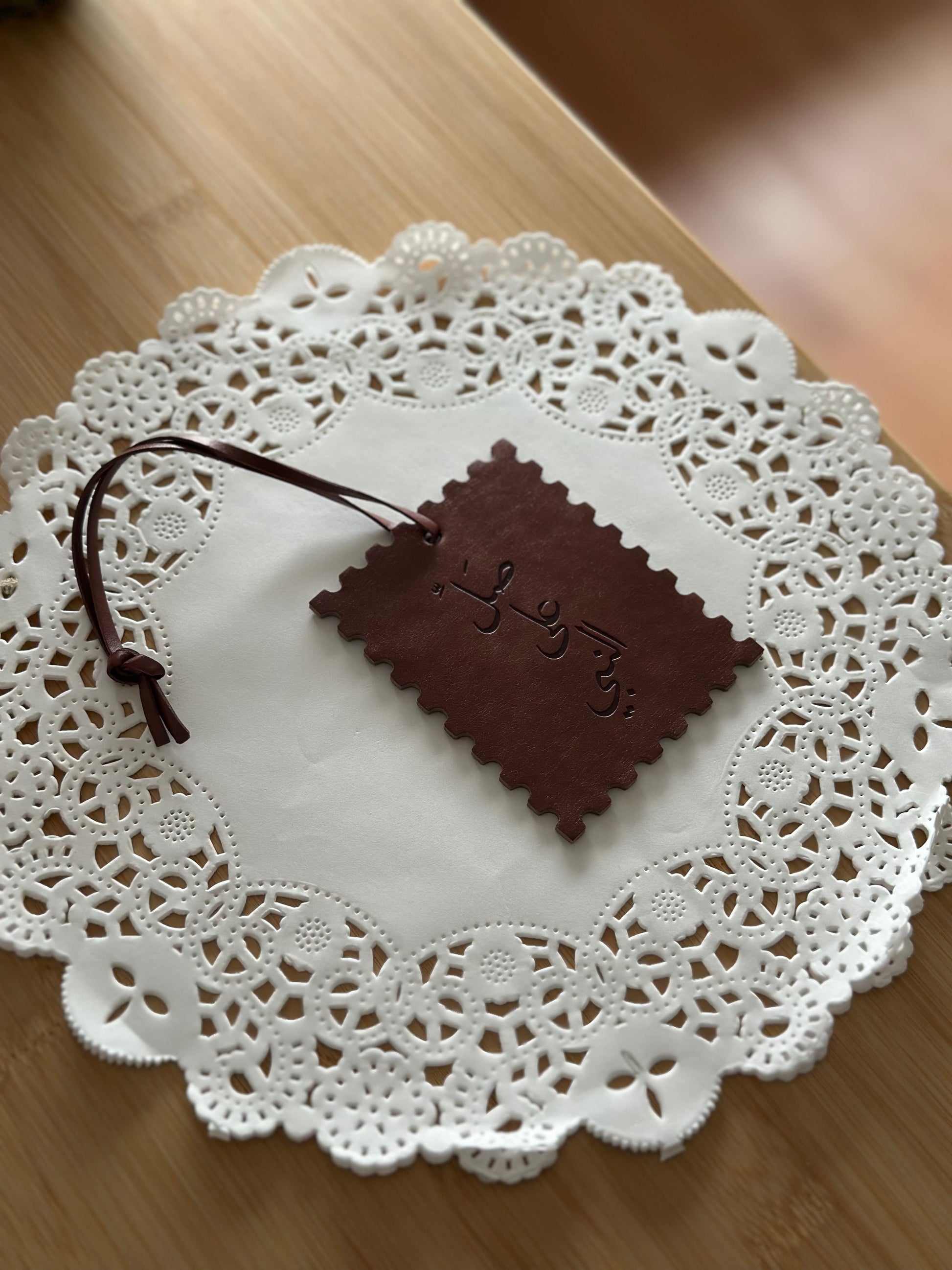 crafted from premium imitation leather, this sturdy charm is shaped like a classic postage stamp — a symbol of messages sent with love. at its heart, in elegant Arabic script, it reads: